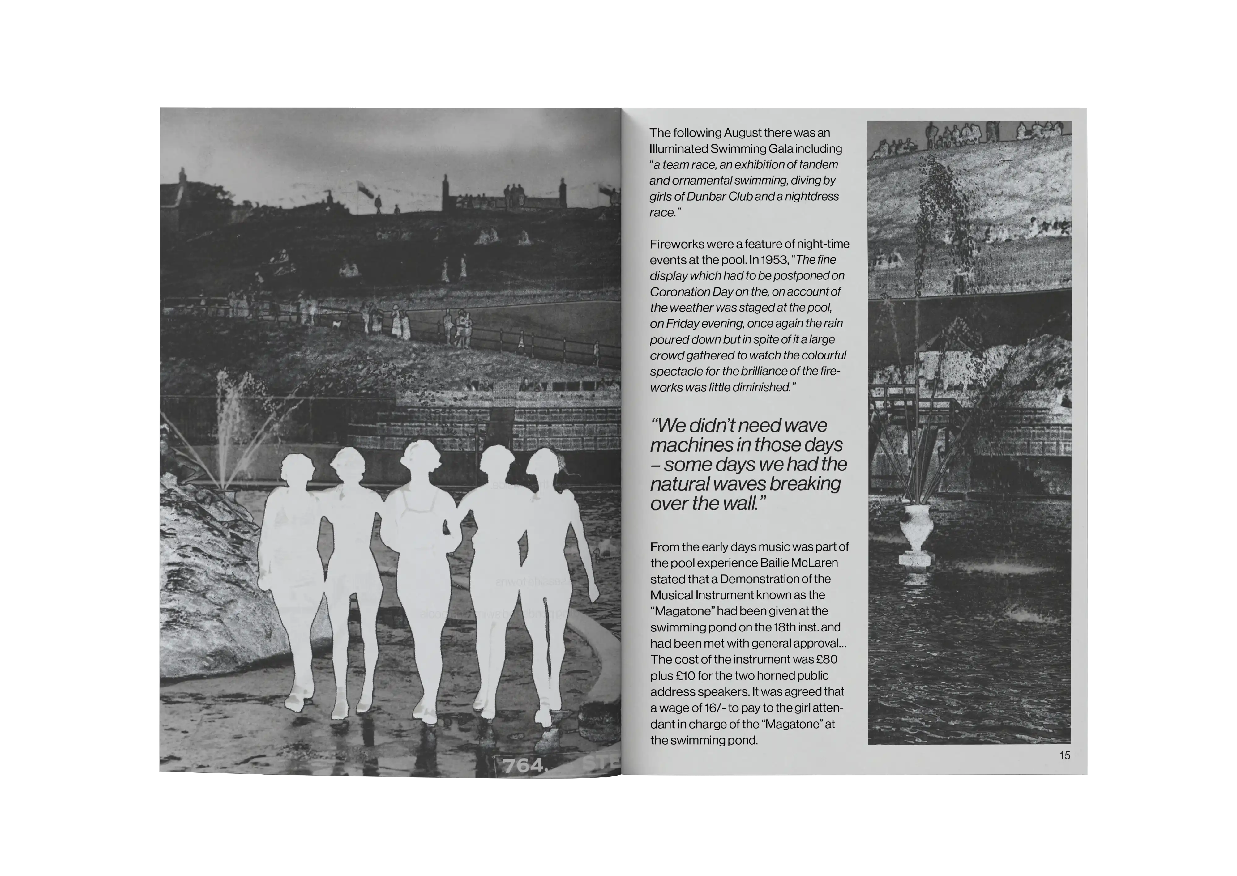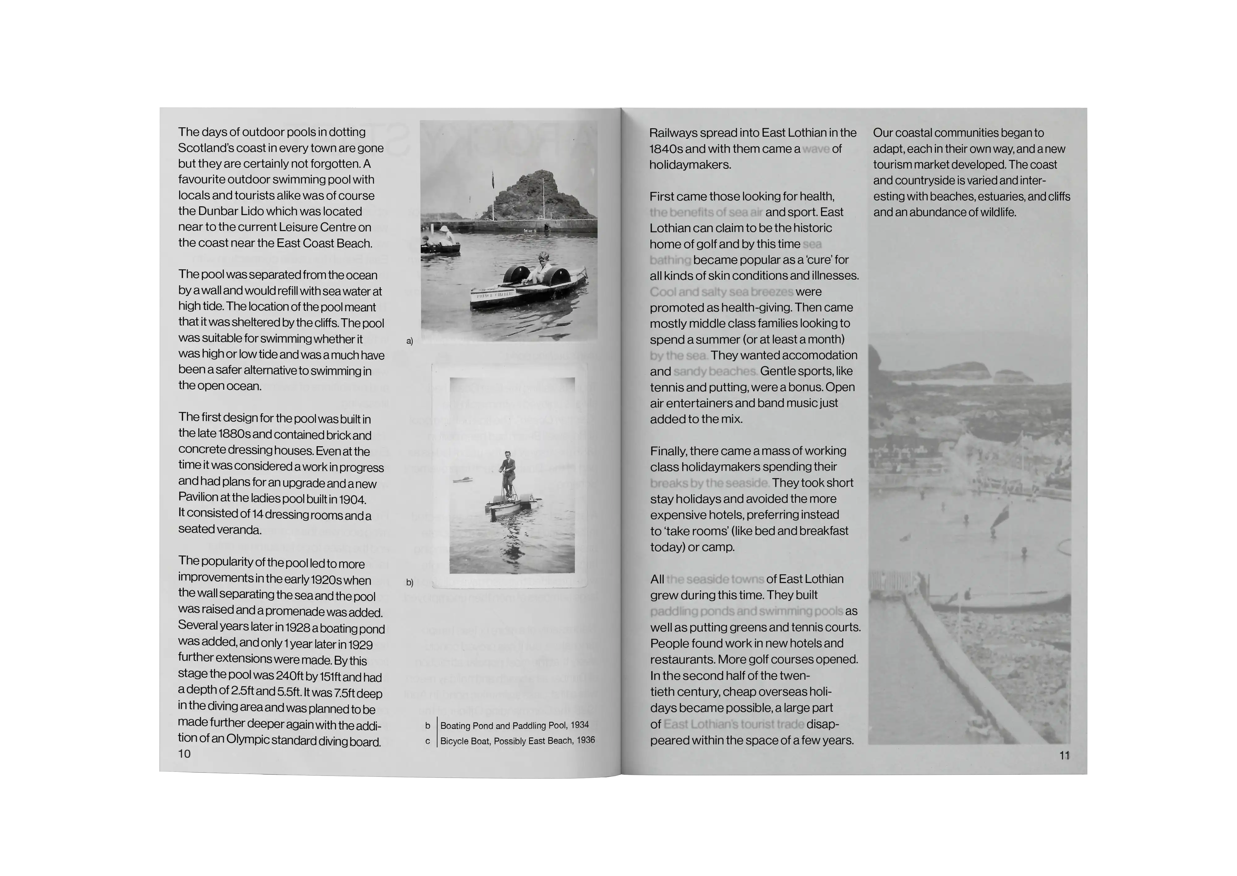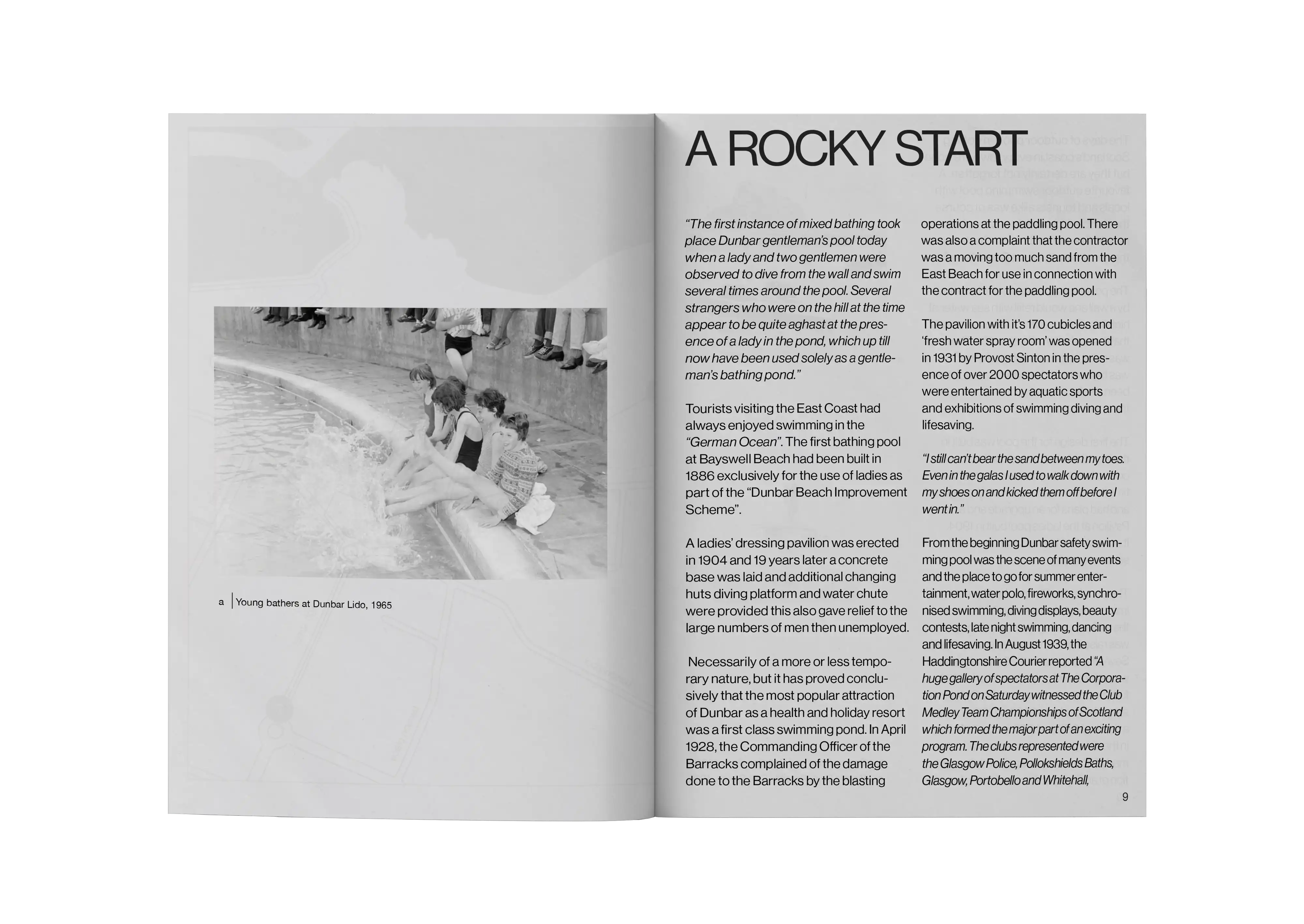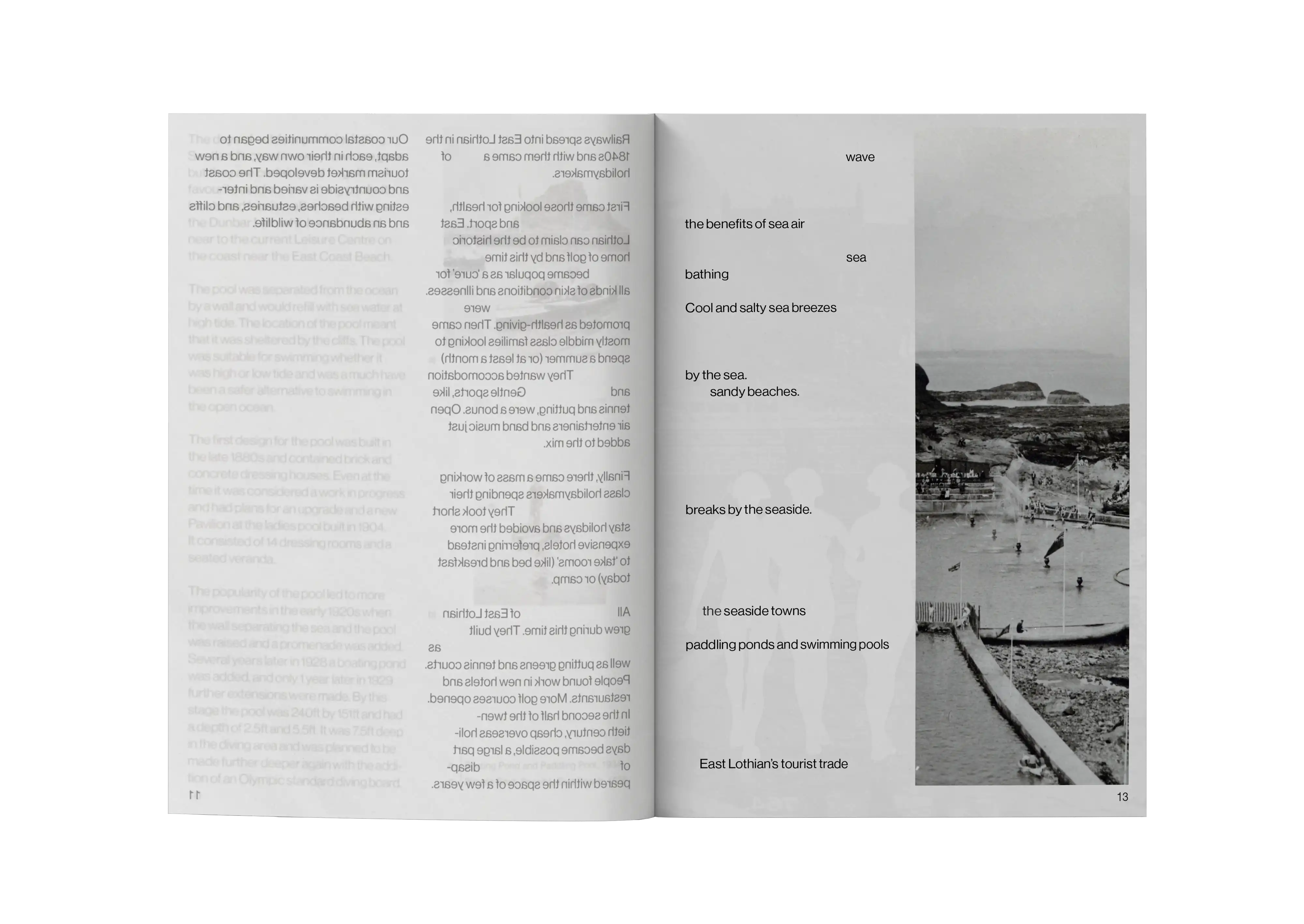 This last point is an important part to the trail as one of the main aims would be that, during the creation of the book, Dunbar locals are interviewed about their memories of the pools and their feelings at the time. The hope is that the creation of the trail would be a community effort, there's already some stories detailed on the website for the Townhouse but to have a physical copy and for their words to be illustrated using typography alongside their images would mean that it could be passed on for more people to hear it.