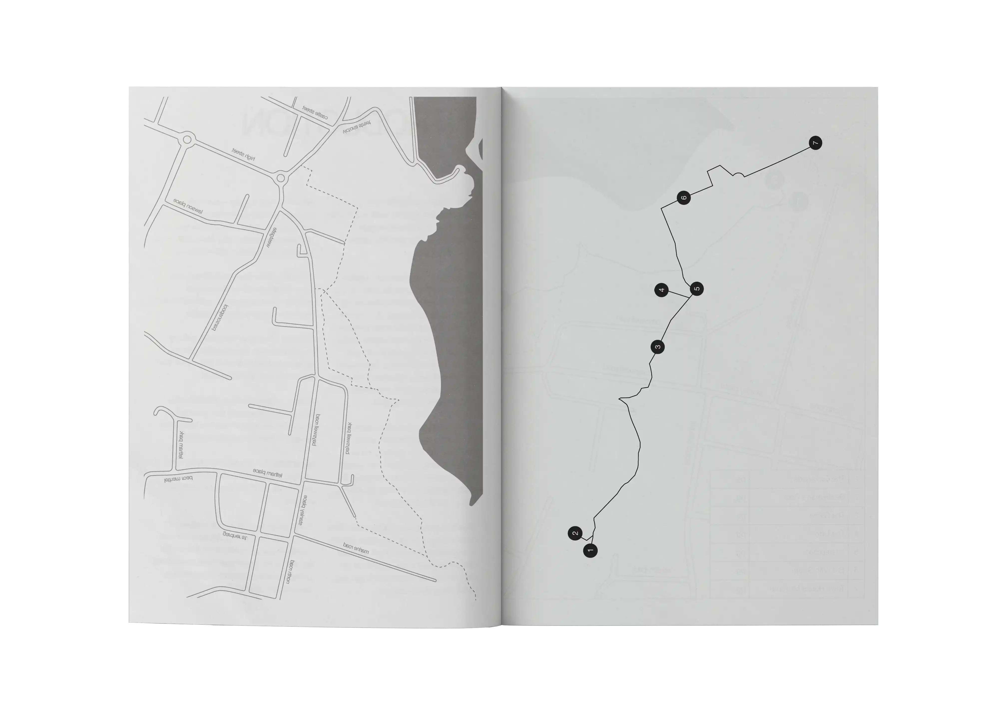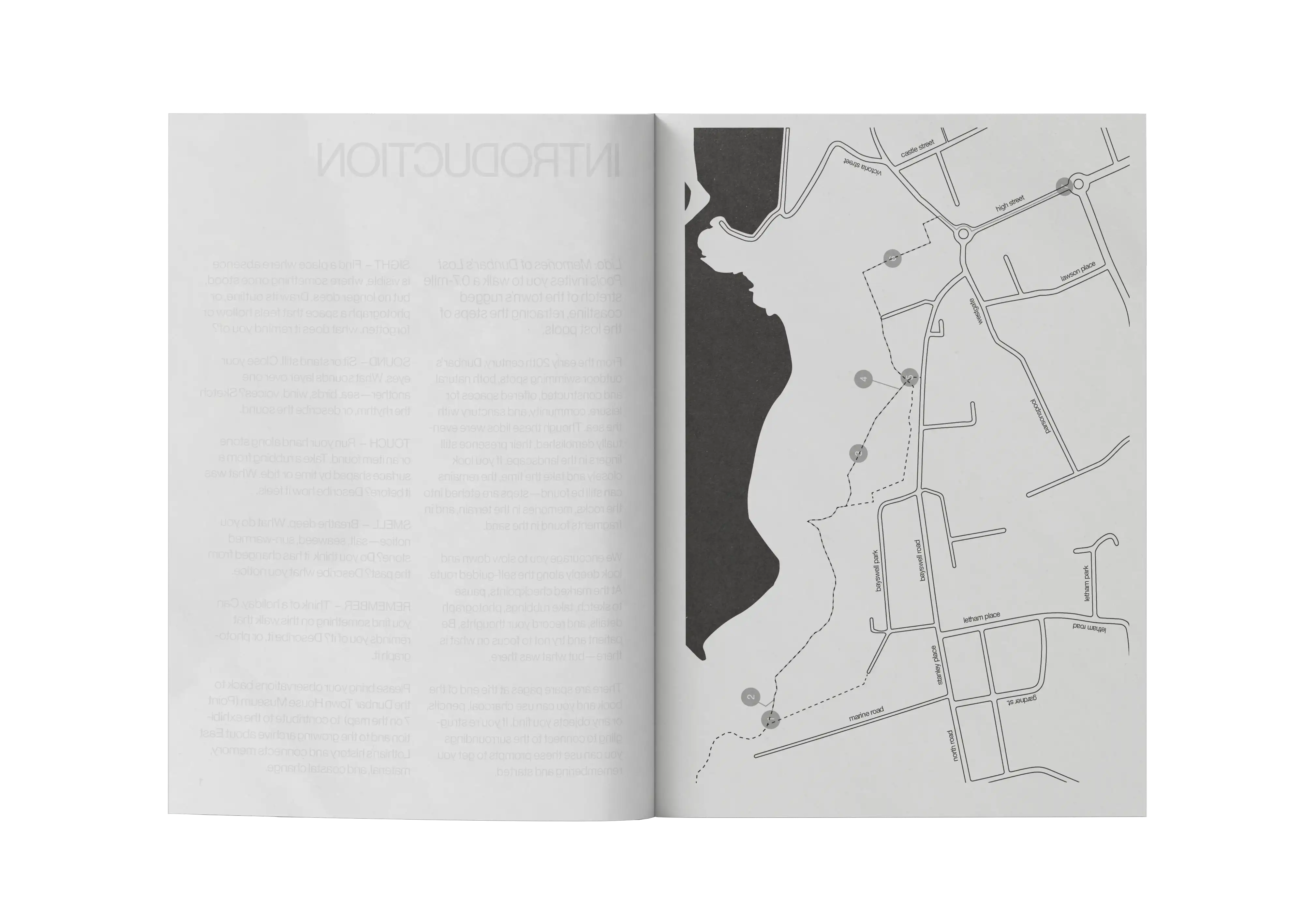 Acting as the guide for the trail would be the supporting book containing a map, suggestions for interacting with the environment, information on the history of the pools, and, most importantly, stories from the people that were there to witness it. Certain words and quotes are emphasised by using the typography and the weight of the paper, on one page you would see a paragraph, with some words slightly faded to give a sense of them fading away, eroding as it were; and when you turn the page you see those words by themselves, giving them dominance over the page, reflecting that engaging with the environment and the sites brings the stories and the memories back to life. The pages have tight margins to feel as though the words could spill off the edge of the book, flowing like water.