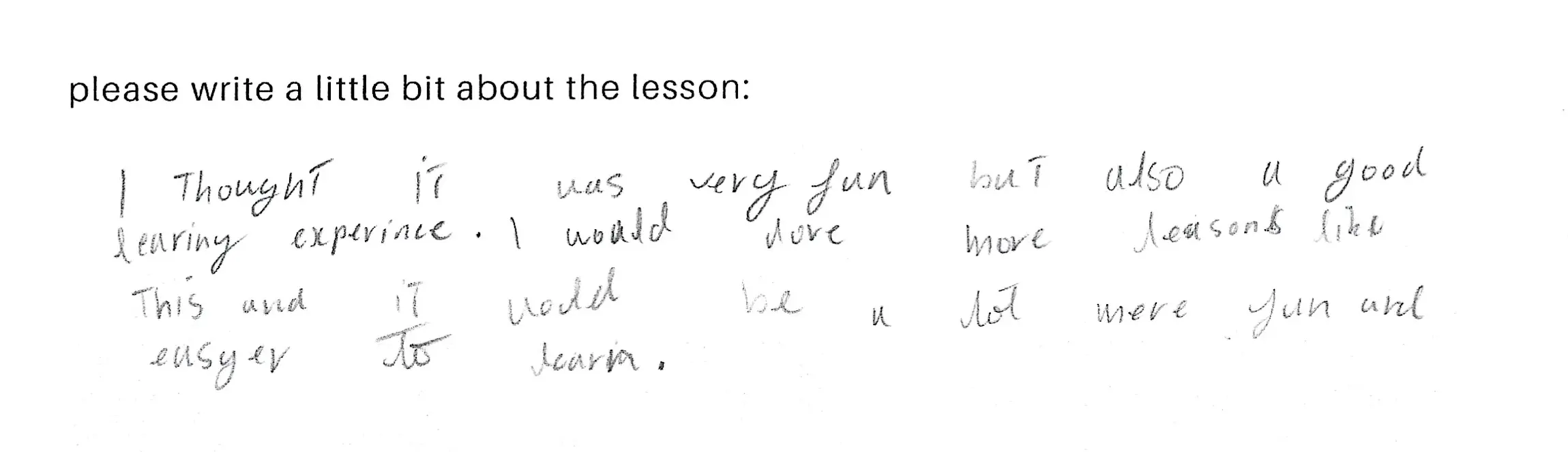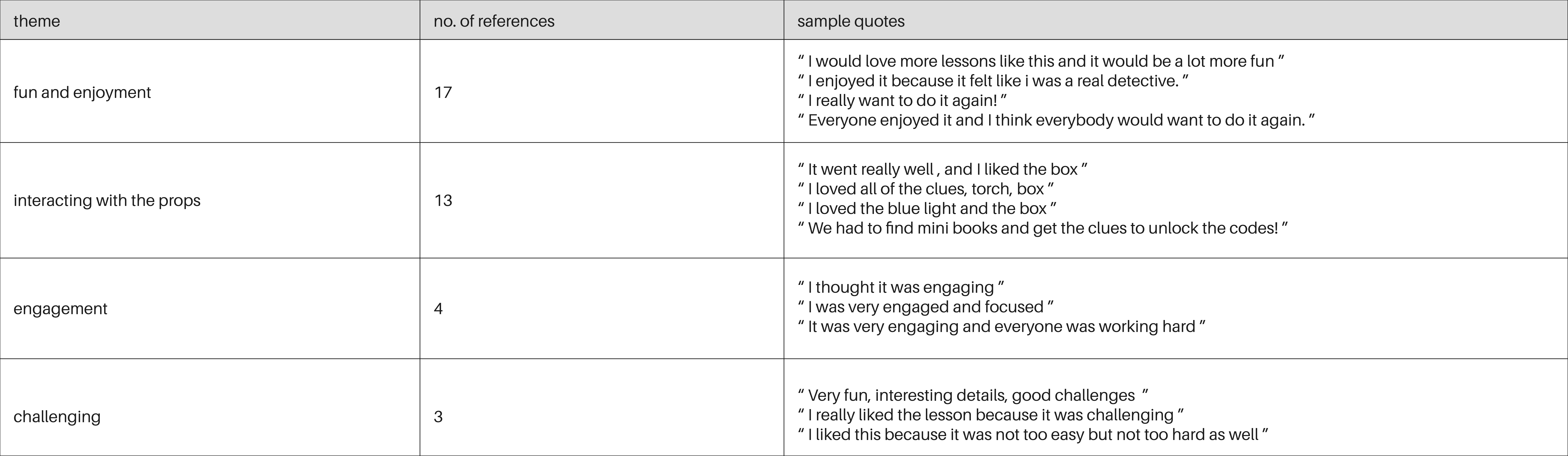 In the majority of the responses from the students they used the word 'fun', all of them thought they worked well as a team, and almost all of them strongly agreed with the fact they were engaged during the lesson. The only negative feedback I received was during the focus group, when I pushed for any criticism, a few of the students didn't enjoy the teamwork aspect, but when I spoke to the class teacher afterward she said they often don't enjoy group activities; the other feedback was that the puzzles were too easy, so I made the Mary King's Close box more challenging and aimed the Burke and Hare box towards a younger key stage group.